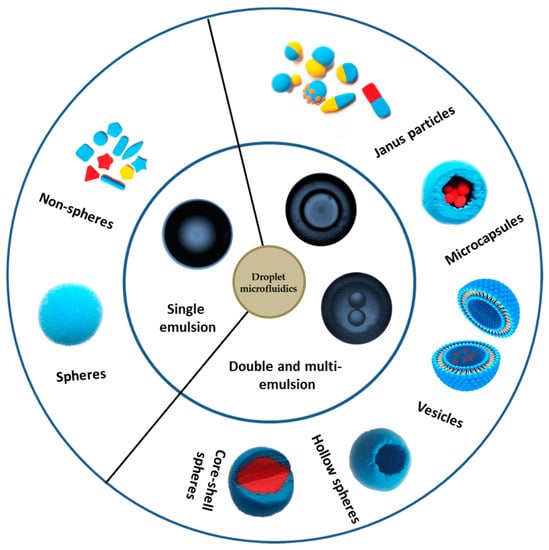 The superior properties of droplet microfluidics are advantageous for precise microparticle manufacturing, especially when used as templates to prepare microparticles and nanoparticles with various morphologies. In general, highly monodisperse emulsified droplets form in a microfluidic device and are simultaneously used as a template, and then are solidified to form microparticles and nanoparticles by chemical, photochemical or physical methods [39]. This review discusses recent advances in microparticle and nanosphere fabrication with droplet microfluidics. Because a single emulsion can be a template for solid spheres, and double or multi-emulsions can be templates for core shells, Janus or other morphology spheres, we classified the emulsion droplets according to their structures, and focused on how the emulsion droplets evolved into various structures and morphologies, as shown in Figure 1. This review provides a general background to those new to droplet microfluidics.