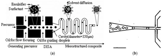 Lee et al. [47], Carroll and another researchers [74,75] reported a one-step method to manipulate ordered mesoporous silica (OMS) in a microfluidic device. This method combined a microfluidic emulsification technique and a rapid solvent diffusion induced self-assembly (DISA) technique. Monodisperse droplets were generated at the flow-focusing orifice and assembled into mesostructured silica/surfactant composite spheres within the microchannel, as shown in Figure 3. The sizes and the surface morphologies were easily controlled by changing the synthesis parameters, such as the geometry of the microfluidic channels, the flow rate of the precursor solution and oil, and the type of oil.