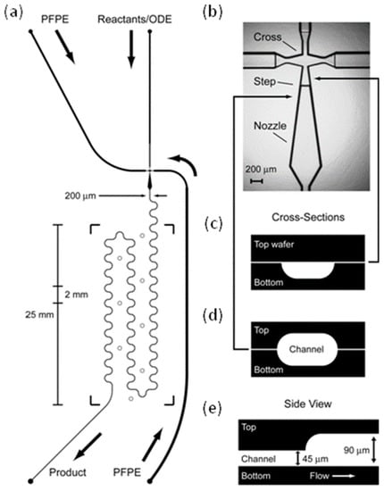 The microreactor channel design with droplet jet injector used by Chan et al. [87]: (a) Channel schematic showing dimensions, inlets (●), thermocouple wells (○), and boundaries of Kapton heater [87] (b) Optical micrograph of droplet injection cross. ODE is injected into the top channel, while the PFPE is injected in the side channels (c) Lateral “D”-shaped cross section of channel etched on the bottom wafer only (d) Cross-section of ellipsoidal channel etched on both top and bottom wafers. (e) Axial cross-section showing the 45 μm stepped up in channel height. Reproduced with permission from Chan, E.M., et al., Journal of the American Chemical Society; published by American Chemical Society, 2005.