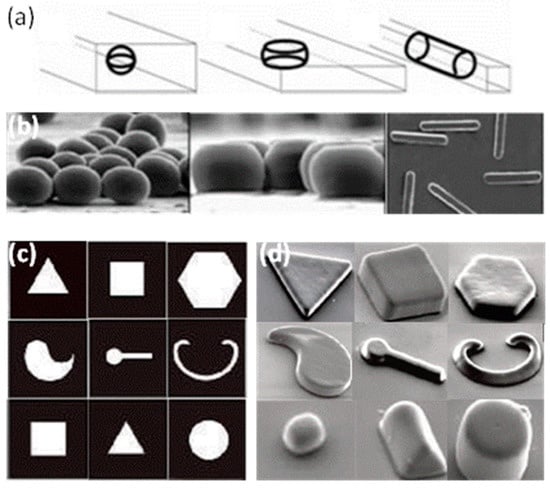 Xu et al. produced particles with different sizes and shapes using the first method [49]. They produced monodisperse droplets in a flow-focusing device, shaped the droplets in the confined channel, and solidified these droplets in situ. This method is applicable to a variety of materials, such as gels, metals and polymers. Some products are shown in Figure 5a,b. Dendukuri et al. easily produced complex and multifunctional particles using the second approach [103]. They synthesized various shapes, such as polygonal shapes, non-symmetric or curved objects, and high-aspect-ratio objects, as shown in Figure 5c,d. The shape and the size of particle is only controlled by the mask, and the morphology and the chemistry of the particles can be independently chosen to form a large number of unique particles for applications in coding, drug delivery and biosensors.