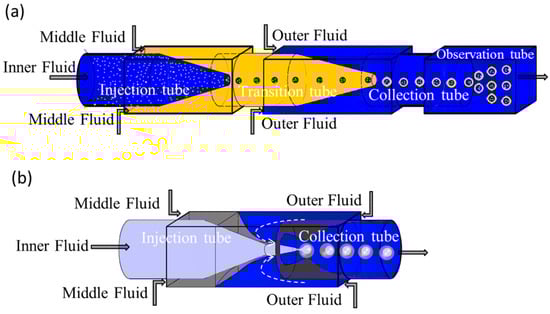 Fabricate of double emulsions in microfluidic devices. (a) Schematic of a capillary microfluidic device that combines double co-flowing geometry adapted from Figure 1 in [107]; (b) Schematic of a capillary microfluidic device that combines co-flow and flow-focusing geometry adapted from Figure 1 in [37].