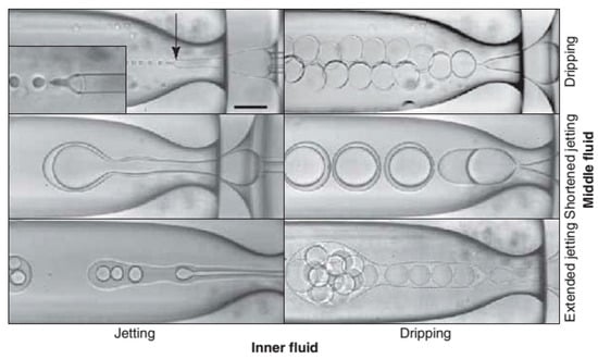 Different morphologies of double emulsions produced by a microcapillary device [109]. Reproduced with permission from Utada, A.S., et al., MRS Bulletin; published by Cambridge University Press, 2007.
