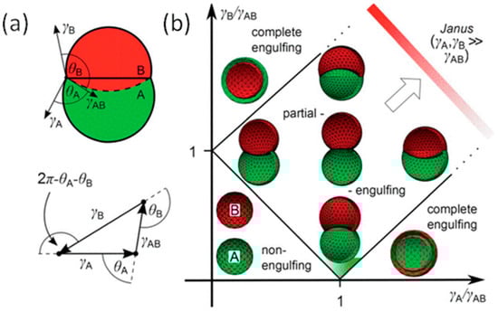 As found by Dowding and Shum, when the polymer was formed by phase separation, the emulsion stabilizer had to be adjusted to control the particle morphology [113,114]. For combinations of a range of liquids, the final equilibrium morphology can be a core shell, or “acorn”-shaped, as shown in Figure 9. The transitions between different topologies of the double droplet can be described as the interfacial tensions model [115]. In the interfacial tension model, the balance of forces acting on the three-phase contact line is expressed in the form of relations (Neumann triangle Law, Figure 9a) between the contact angles and the interfacial tensions: