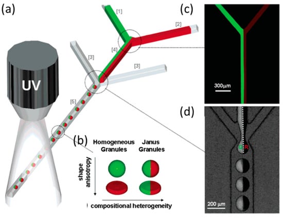 (a) Schematic representation of sheath-flow microfluidic device used to produce monodisperse colloid-filled hydrogel granules; (b) Schematic view of granule shapes and compositions explored; (c) Fluorescent image of Y-junction formed by inlets [1,2] for the production of Janus spheres; (d) Backlit fluorescence image (green excitation) illustration that the fluorescein isothiocyanate (FITC)-silica microspheres remain sequestered in the left hemisphere of each granule generated. Pictures are from [124]. Reproduced with permission from Shepherd, R.F., et al., Langmuir; published by American Chemical Society, 2006.