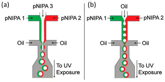 Hydrogel Janus is composed of two hydrogel phases produced from two completely immiscible hydrophilic monomer fluids. Unlike the principle for fabricating homogeneous particles, here, two separate streams are co-flowing through the same channel of the microfluidic device. However, the two fluids must remain parallel and the interface between them must be stable at different temporal and spatial scales, and any perturbations can lead to the formation of particles with mixed internal morphologies instead of particles with two distinct sides [24].