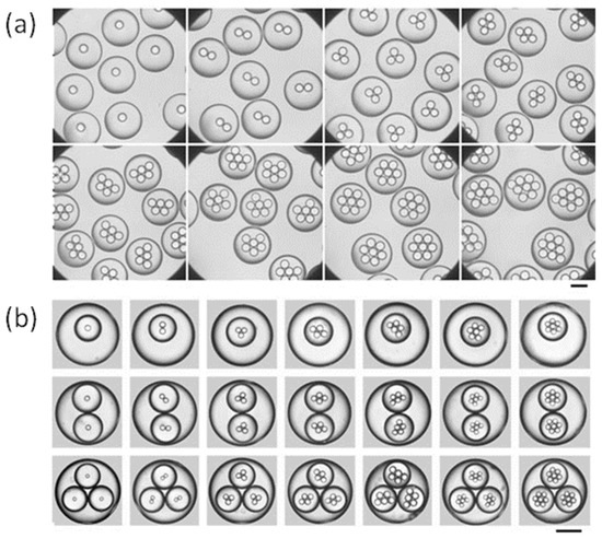 (a) Optical micrographs of double emulsions that contain a controlled number of inner droplets; (b) Optical micrographs of triple emulsions that contain a controlled number of inner and middle droplets. The scale bar in all images is 200 μm. Pictures are from [136]. Reproduced with permission from Chu, L.-Y., et al., Angewandte Chemie International Edition; published by John Wiley and Sons, 2007.