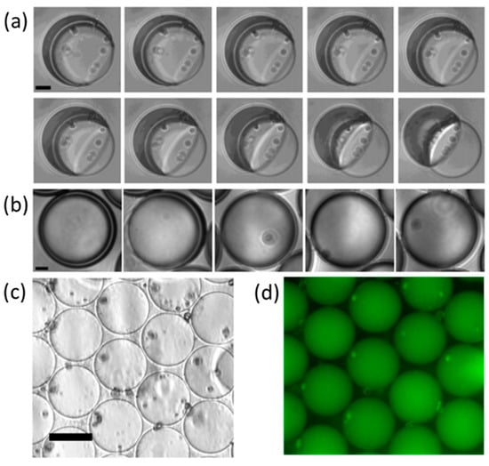 (a) Bright-field microscope images of a PEG(5000)-b-PLA(5000) polymersome undergoing dewetting transition; (b) Bright-field microscope images of a PEG(1000)-b-PLA(5000) polymersome undergoing the evaporation of the organic solvent shell; (c,d) Bright-field and fluorescence microscope images of a dried capsule formed from the PEG(1000)-b-PLA(5000) diblock copolymer. Pictures are from [114]. Reproduced with permission from Shum, H.C., et al., Journal of the American Chemical Society; published by American Chemical Society, 2008.