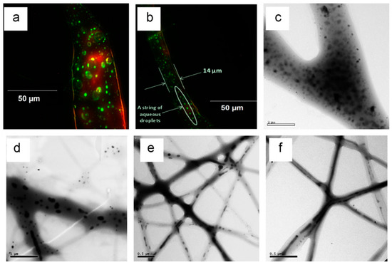 Morphological evaluation of the water phase in electrospun fibers collected at different locations of the emulsion jet path: (a,b) fluorescence microscopy images of fibers; (c–f) TEM micrographs at different magnifications. Pictures are from [148]. Reproduced with permission from Wang, C., et al., Materials Letters; published by Elsevier, 2014.