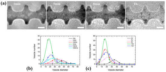 The frequency was then fixed at 10 kHz to study the effect of the applied voltage (Figure 2c). No vesicles except some swelling lipid membranes were formed in the center when the voltage was less than 5 V. More and more GUVs began to generate with increasing electric field strength and decreased in the average size when the amplitude was varied from 5 V to 16 V (Figure 2d, 16 V, 10 kHz).