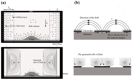 In the 3D electrode system, the functional electric double layer (EDL) was formed near the chamber wall (made of PDMS) ignoring the deformation of the lipid film shown as Figure 4a. The formed EOF under an AC field thus depended on the zeta potential (ζ) of the chamber wall which was usually considered as uniform and constant under some assumptions [22] and was set to 50 × 10−3 V in this work. In the 2D electrode system, the AC applied field might act on its own induced diffuse charges near a polarizable electrode (Figure 4b). Compared with the 3D electrode system, the 2D one could concentrate the electric field on the substrate and the functional zeta potential was much higher related to the applied voltage.