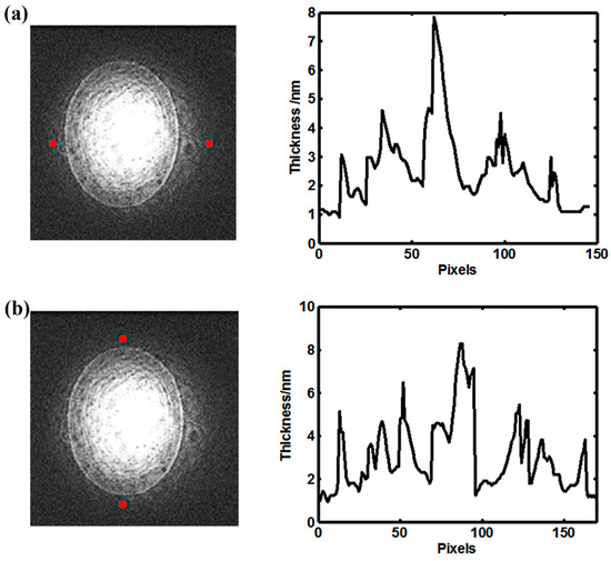 The conductivity of the used aqueous solution (200 mm sucrose solution) was measured by using the conductivity detector (METTLER TOLEDO, Columbus, OH, USA) which was 5 × 10−4 S/m. The properties of the liquid were assumed to be constant because the Joule-heating produced by the applied electric field can be neglected when the conductivity was so low. The properties of the aqueous solution, such as the relative dielectric constant of the solution εr ~ 80, density ρ ~ 1000 kg/m3, viscosity μ ~ 9 × 10−4 Pa∙s, temperature T ~ 293.15 K, and the dielectric constant of the lipid film εm ~ 5, were adopted and assumed to be constant. The thickness of lipid film was measured by a homemade surface plasmon resonance (SPR) imaging device [23]. During the detection, the organic solution of the lipid mixture was diluted 1000 times to ensure the film thickness within the effective detection range of the device. The results were shown in Figure 5 and the average thickness of the lipid film dm was 2 μm and assumed to be flat in the numerical simulation.