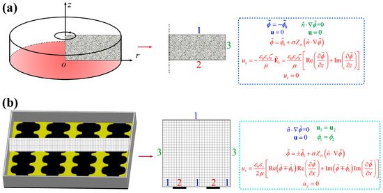 The schematic diagrams of the 3D (a) and 2D (b) electrode system, and their corresponding boundary conditions.