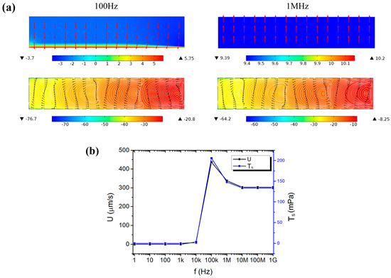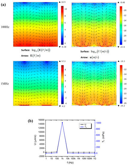 The impact of frequency (from 1 Hz to 1 GHz, ×10 for interval) was calculated when 0 was fixed at 12 V. Vortexes were formed in the preparation chamber. Most of the applied voltage dropped across the lipid film and the bulk electrolyte when the frequency was lower and higher than 100 kHz, respectively. When the frequency was lower than 100 kHz, the electric field in the bulk electrolyte was reversed with respect to the applied electric field, as well as the formed vortex shown in Figure 7a. This may be due to the lipid film being treated as a capacitor in this work which would store the energy and discharge to the solution at low frequency. It implies that the reversal of the direction of the formed ACEO can be induced by the frequency. The maximum value of the load (Ts) the lipid film experienced from the ACEO was shown in Figure 7b. It maximized at 100 kHz, which suggested that a characteristic frequency did exist in the 3D electrode system. In addition, the ACEO also maximized at this frequency, which was not consistent with the previous result that ACEO predominated at low frequencies and attenuated with increasing frequency [22].