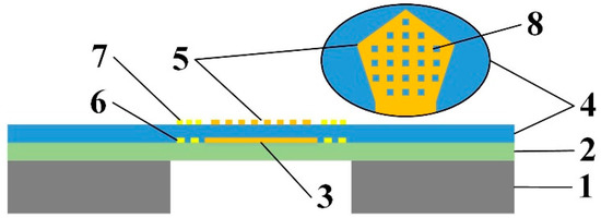 Cross-section of the film bulk acoustic resonator (FBAR) chip with detail of the micro through-holes in top electrode. 1—Silicon substrate; 2—Silicon nitride support film; 3—Bottom electrode; 4—ZnO piezoelectric film; 5—Top electrode; 6—Resistor heater; 7—Resistor temperature sensor; 8—Micro through hole.