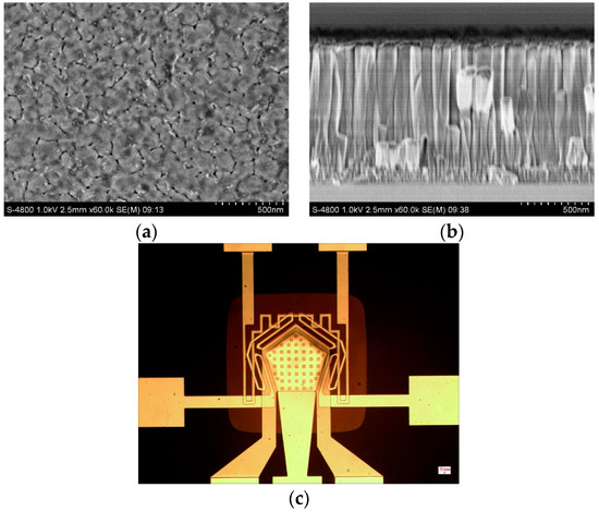 Scanning electron microscope (SEM) photos of the ZnO film: (a) top view; (b) cross-section; (c) the microscopic photo of the fabricated FBAR chip.