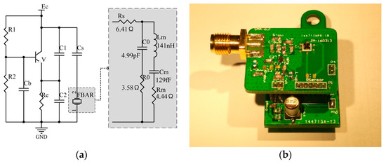 The frequency of FBAR sensors requires great effort to be detected, especially when it is above 1 GHz. With an advanced instrument, such as a network analyzer, it was detected in the laboratory [24,25]. To expend their detection application, an oscillator circuit for the FBAR sensors is important. Exploration of the resonator’s lumped element equivalent model had been reported for the circuit design [26,27]. An oscillator circuit with FBARs had been fabricated with different structures [13,28,29]. Furthermore, the performance of the integrated sensor will be affected by its circuit section. It had been reported that the supplied voltage of the oscillator circuit changed its frequency and this effect was used for the temperature compensation of the FBAR sensor [30]. However, there have been few studies about the effect of the circuit on the response of the FBAR sensor.