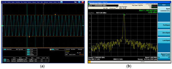 The signal output from the sensor sample was detected and the results are shown in Figure 6. With a supplied voltage of 3 V, the peak-to-peak value of the waveform was 484 mV. In the spectrum, the power of the signal was −2.6 dBm and the phase noise was −90 dBc/Hz@100 kHz. The frequency signal was strong with a high-quality detection application of the sensor.