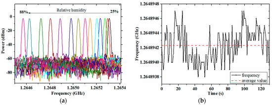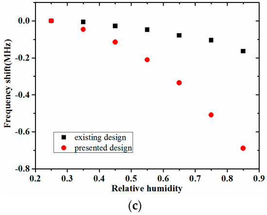 Relative humidity detection results of the FBAR sensor samples: (a) resonant peak shifts of the presented sensor and (b) random variation of its frequency; (c) comparison of the frequency shifts.