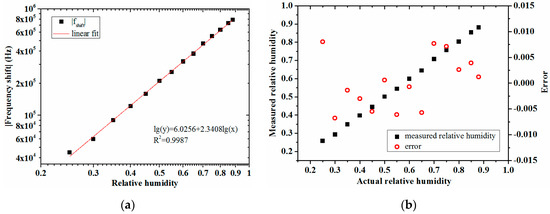 Analysis of the presented sensor’s response to relative humidity: (a) linear fit between lg(fshift) and lg(RH); (b) the measurement error.