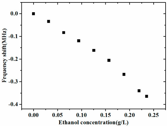 The frequency shift of the presented sensor sample with changed ethanol concentration.
