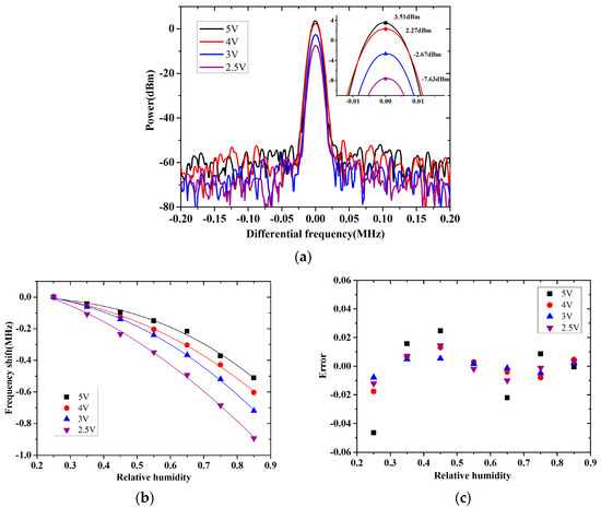 When the sensor sample was used for humidity detection, a different voltage was supplied to the oscillator circuit. Except for the frequency, the power of the output signal changed, as shown in Figure 10a. It meant that the oscillation amplitude of the resonator varied with the supplied voltage of its oscillator circuit. The responses to the relative humidity of the sensor sample with different supplied voltages were detected. As shown in Figure 10b, when the supplied voltage decreased from 5 to 2.5 V, the frequency shift for the detected range increased and the parameter n in Equation (5) decreased from 2.7 to 1.8, which meant that adsorption on surface of the sensor became easier. The measurement results matched the analysis above. Of all the measurement errors in Figure 10c, the one with the 3 V supplied voltage had the smallest error value. It indicated that a low supplied voltage of the circuit was beneficial for the high sensitivity of the sensor, but the accuracy could be reduced when it was too low. The analysis was useful in choosing the supplied power for the sensor to optimize its detection application.