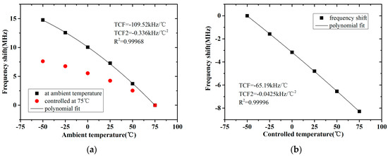 When the temperature changes, except for the resonator, the components and parasitic parameters in the oscillator circuit are affected. Then response of the sensor sample to temperature is divided into the two sections. As shown in Figure 11a, at different ambient temperatures, the frequency shifts of a sensor sample and the same sample with the resonator controlled at 75 °C by the integrated thermal resistors were detected. Between them, the former one was the temperature response of the whole sample and the latter one was the response of the circuit section. To obtain the temperature response of the resonator section, the sensor sample was placed at −50 °C, and the temperature of its resonator was controlled at different values, as Figure 11b shows.