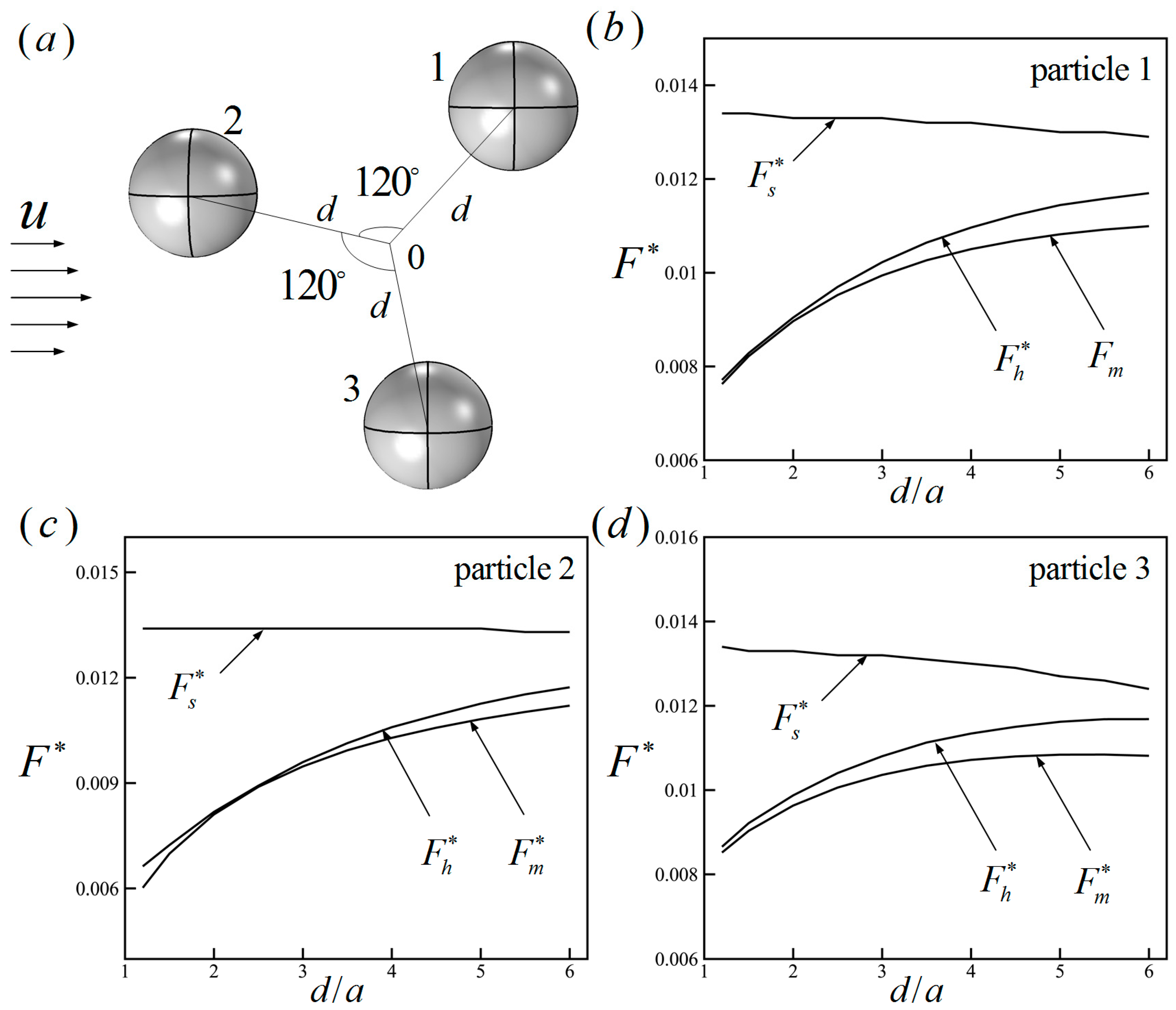 (a) The distribution of three particles; (b–d) the dimensionless hydrodynamic forces versus the ratio of the distance and the particle radius. , and are the hydrodynamic forces, respectively calculated by integrating the hydrodynamic stress tensor, the traditional Stokes formula and the modified Stokes formula.