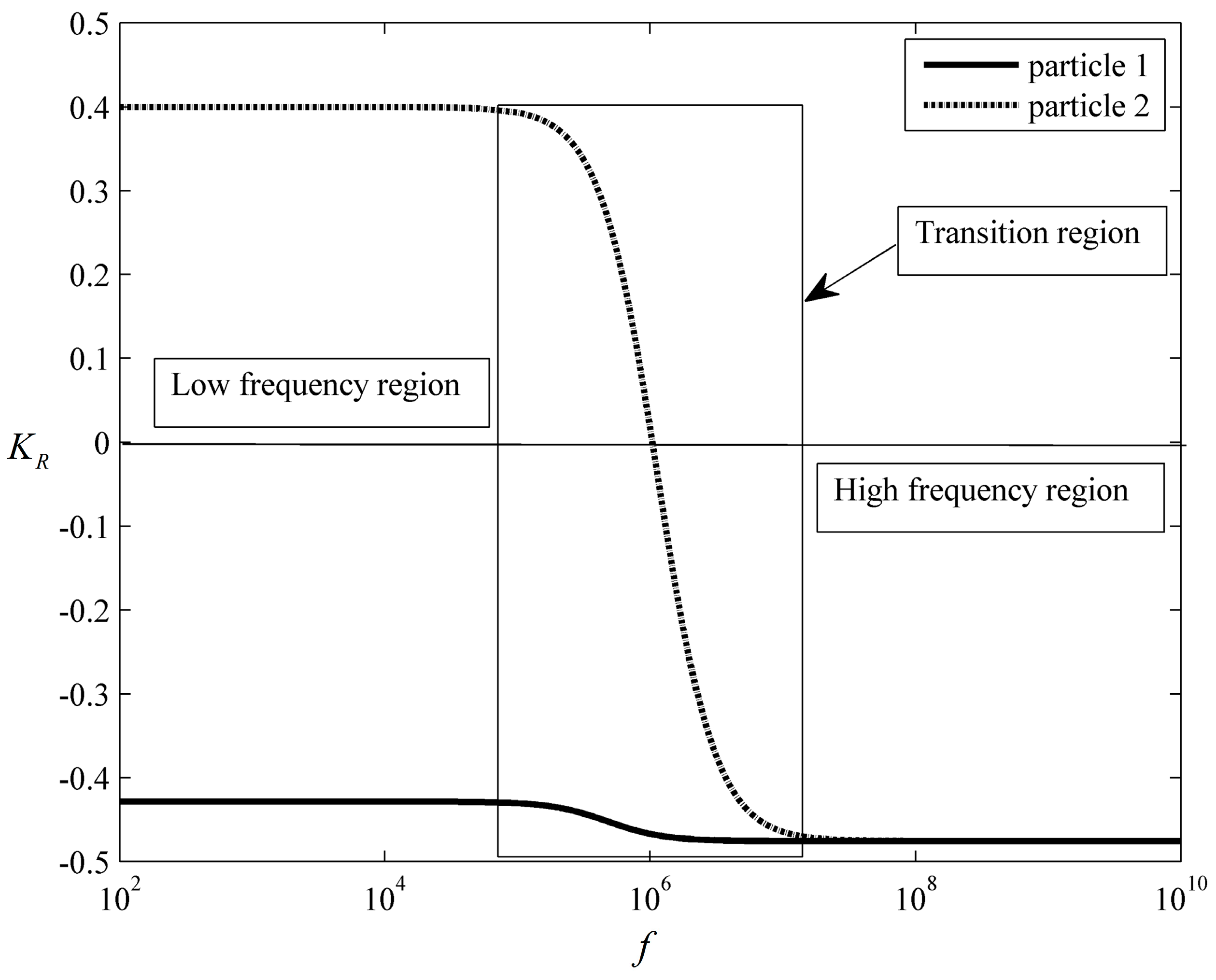 The real parts of the C–M factors of the two types of particles as a function of the frequency. In the low-frequency region, particle 1 is an nDEP particle, while particle 2 is a pDEP particle. In the transition region, particle 2 is transformed from a pDEP particle into an nDEP particle. In the high-frequency region, both particles are nDEP particles.