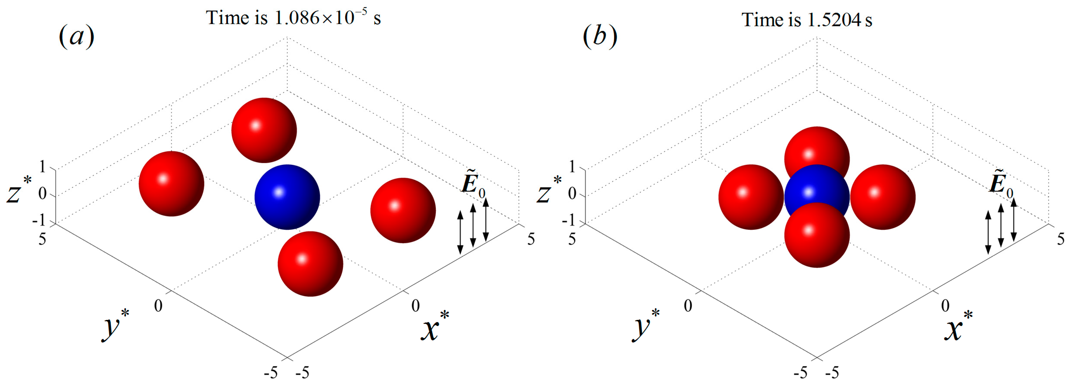 The DEP interaction of five particles initially positioned on a plane perpendicular to an AC electric field with and . (a) The initial particle locations; (b) the final cross-shaped particle chain. The blue and red colors denote pDEP and nDEP particles, respectively.