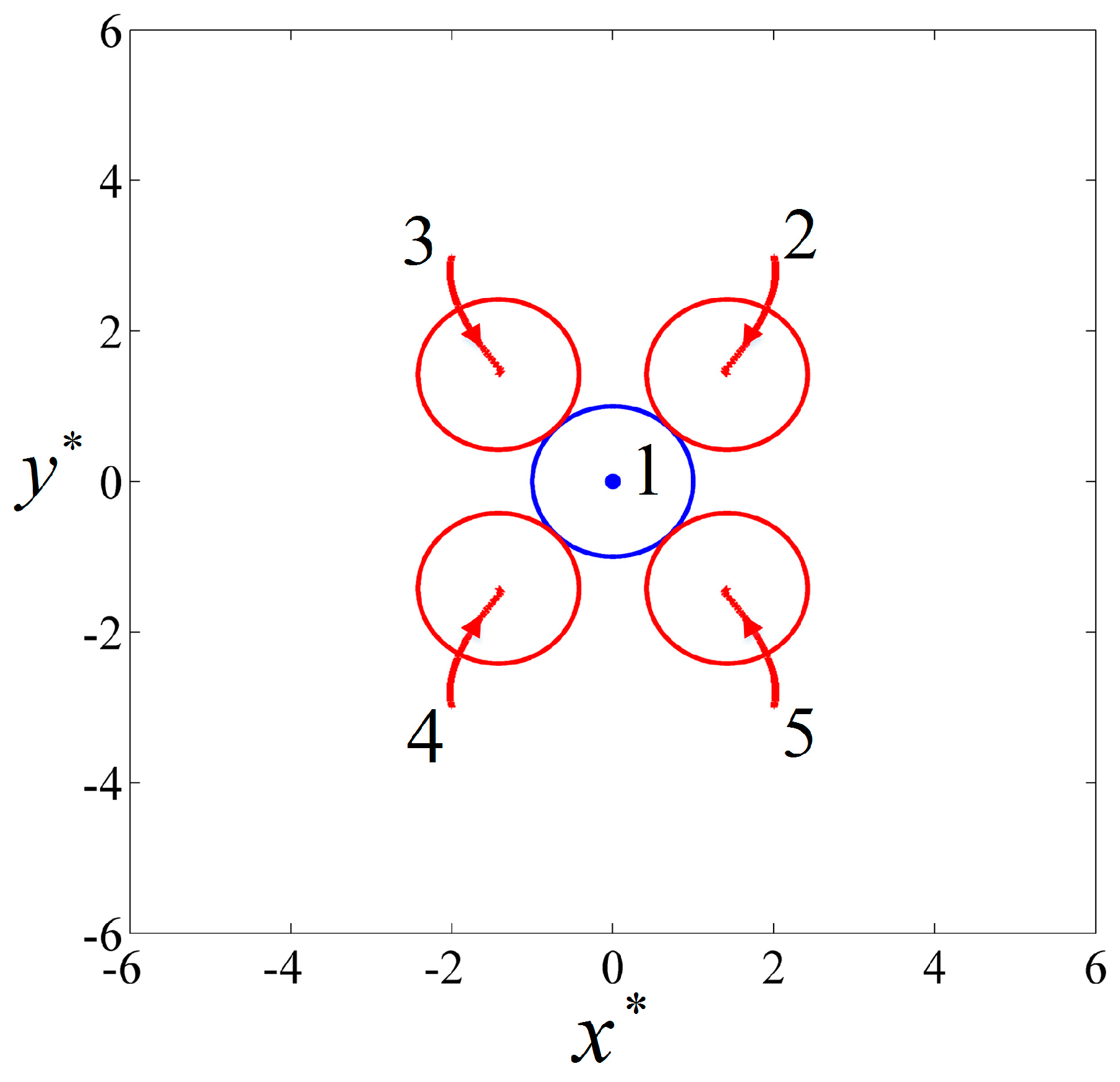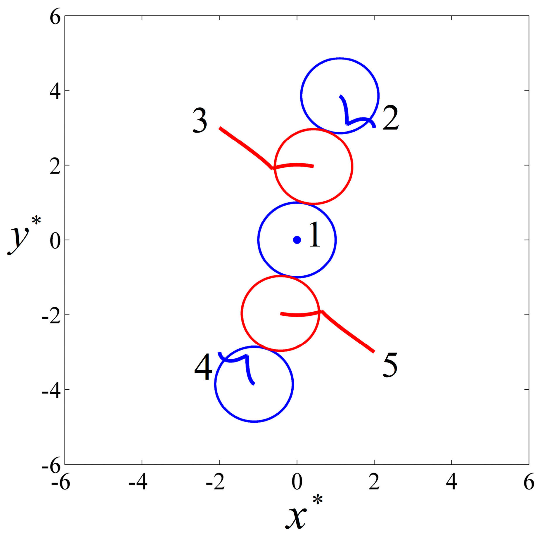Five particles with the same size () were positioned on a plane perpendicular to the uniform AC field in the electrolyte. The initial locations of the five particles are listed in Table 1. Four particles were symmetrically distributed about the central particle 1. The permittivities and conductivities of the particles were and , , respectively. When a uniform AC field with was applied, particle 1 behaved as a pDEP particle while the other four particles behaved as nDEP particles, according to Figure 3. The initial particle locations and the final particle chain are shown in Figure 4, where the blue and red colors denote pDEP and nDEP particles, respectively. As we can see, the four nDEP particles were attracted by the central pDEP particle and moved towards the center. Finally the nDEP particles distributed symmetrically around the pDEP particle as the neighboring nDEP particles kept almost the same distance from each other, and a cross-shaped particle chain was formed.