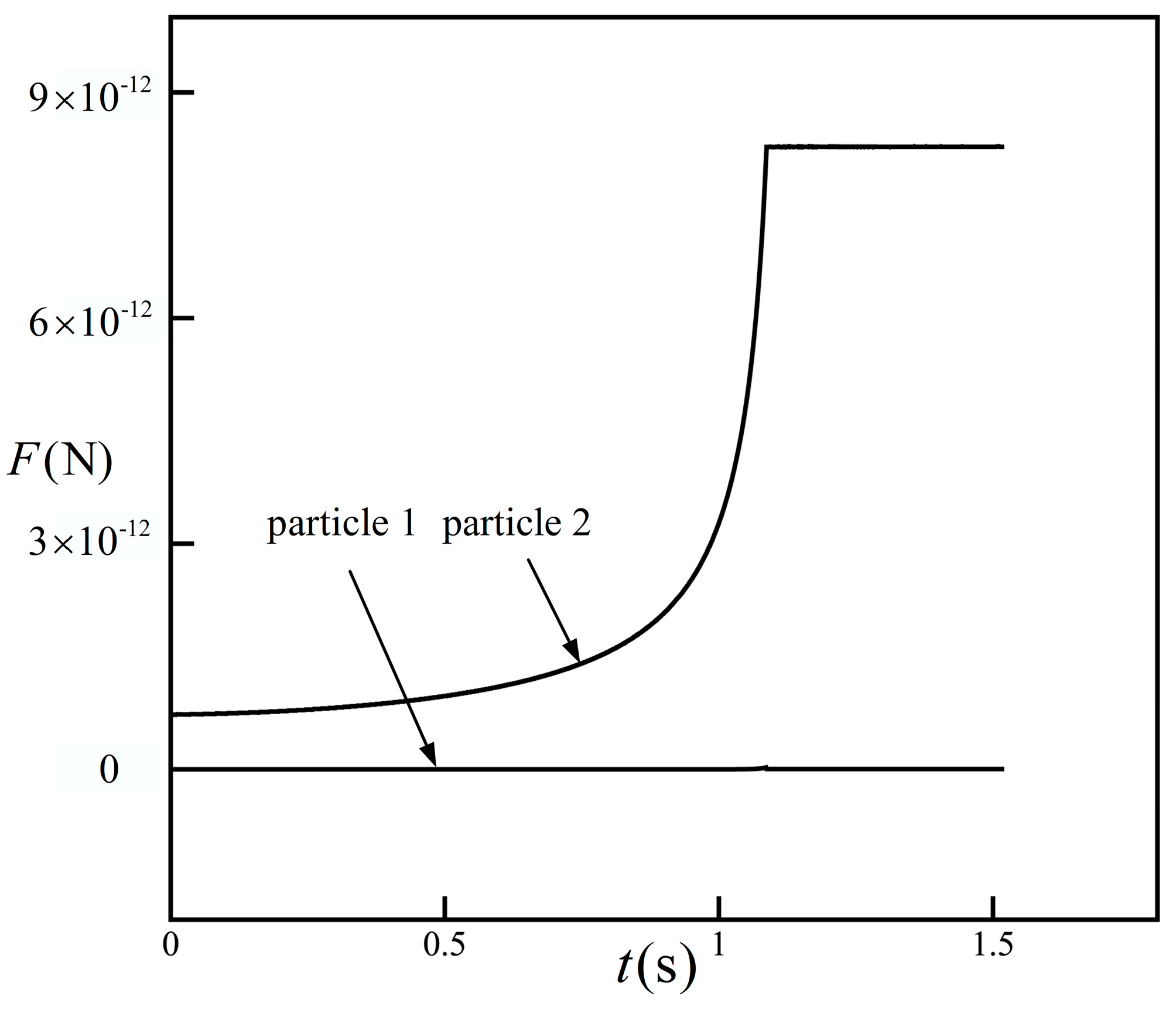 The DEP interactive forces of particle 1 and particle 2 with time. The force of particle 1 is almost zero, the force of particle 2 increases rapidly as particle 2 get closer to particle 1, and finally reaches a constant value when the particle group is formed.