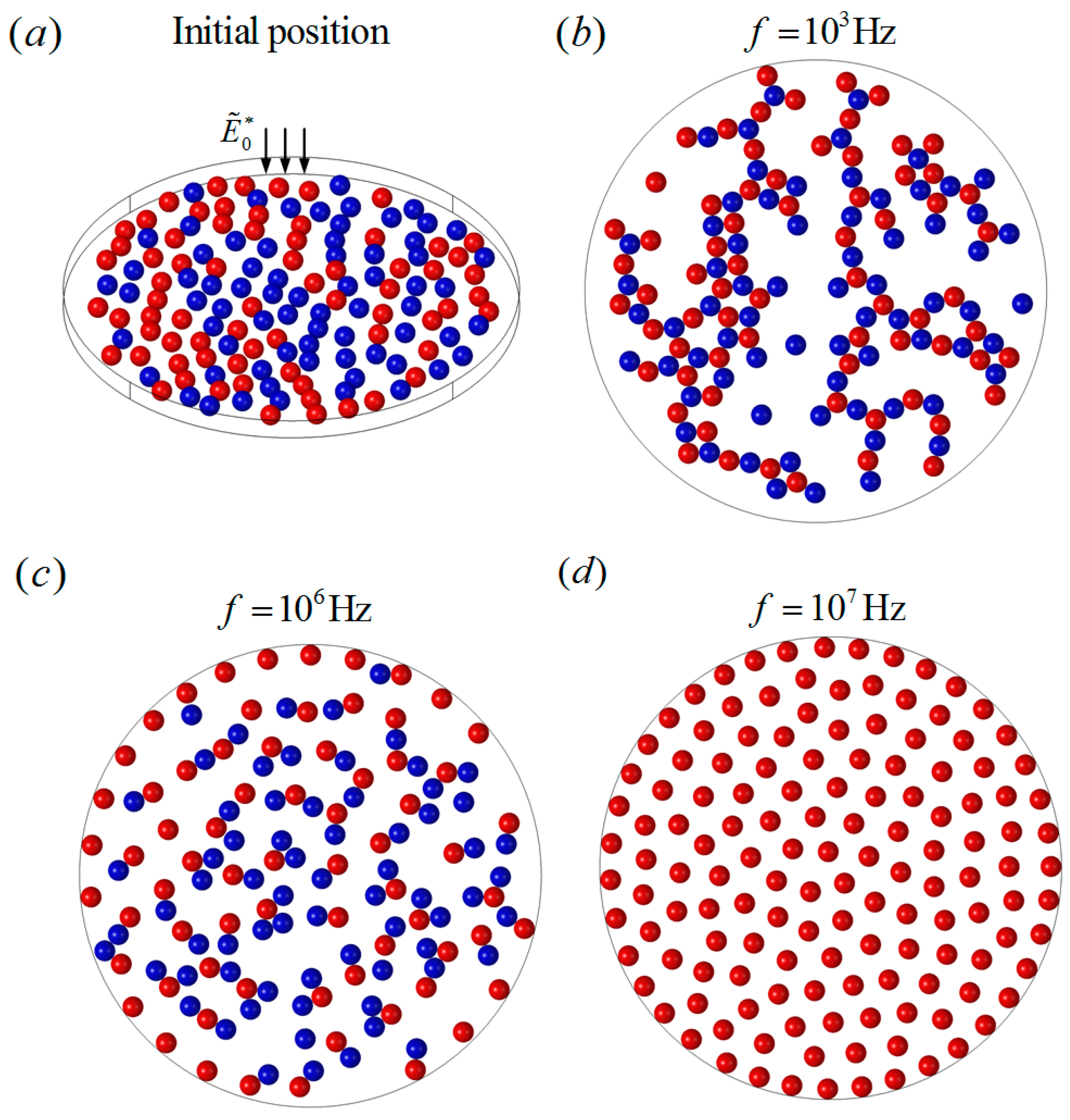 The DEP interactions of randomly distributed particles on a bounded circular plane chip under a perpendicular AC field with different frequencies. (a) The initial random distribution of 140 particles; (b) the particle chains when ; (c) the particle chains when ; (d) the uniform distribution when .