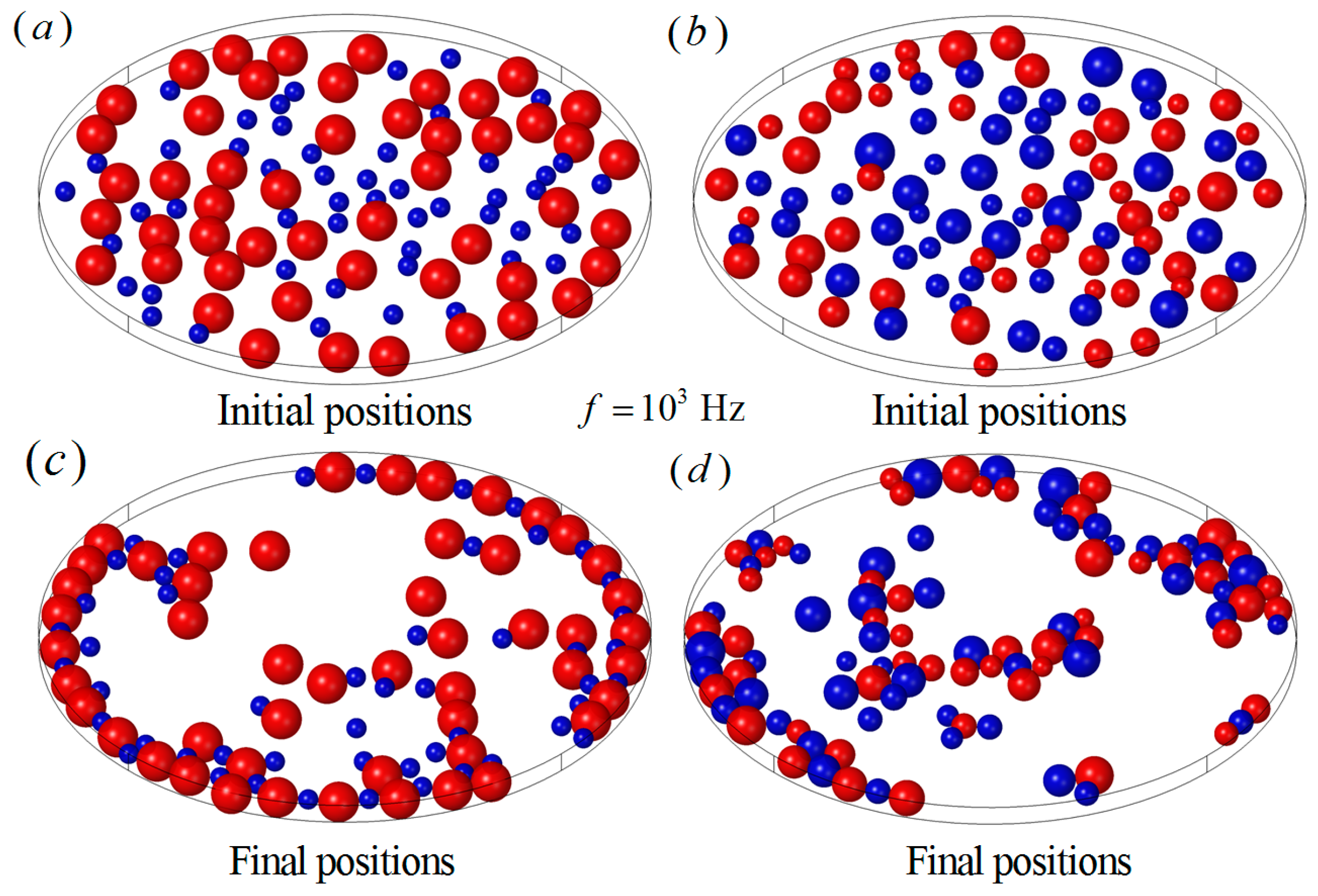 Particle chain behaviors of different particle sizes and conductivities were also investigated in this work. One hundred particles were split into two groups (50, 50) and the particle properties were specified as , , and , , , respectively, as shown in Figure 11a. The frequency of the electric field was . The rest of the parameters remained the same as in the previous examples. The small particles behaved as positive DEP particles and the large particles behaved as negative DEP particles in the present example. It can be seen that the large particles experienced large repulsive forces between each other and small attractive forces from the small particles. The large particles were repelled from the boundary, while the small particles were attracted by the large particles and, finally, long particle chains along the wall were formed, as shown in Figure 11c. In the case of particles with random radii, from to , 50 particles with the properties of , behaved as positive DEP particles, and the other particles with the properties of , behaved as negative DEP particles, as shown in Figure 11b. The particles were more likely to form clusters than long chains, as shown in Figure 11d.