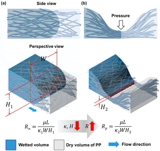 Nonwoven PP sheet is composed of PP fibers that form a medium through which fluid can flow (Figure 1a). The flow through a PP sheet having a constant cross sectional area can be simplified by the Darcy’s law and is expressed by the following equation: