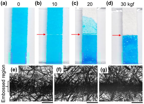 Embossed barrier assessment. (a) Distilled water mixed with blue dye was loaded to one end of the strip and wets the whole strip; (b) Strip embossed with 10 kgf; and (c) 20 kgf fails to prevent the dye solution from leaking; (d) Strip embossed with 30 kgf successfully prevents water from flowing over to the other side. Red arrow indicates the location of embossed barrier; (e–g) SEM images of the barrier embossed with 10, 20, and 30 kgf, respectively (scale bars = 200 μm).