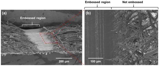 Close-up SEM images of embossed region. (a) Perspective view showing the difference in the sheet thickness; (b) Close-up view of the top of an embossed region showing flattened and densely packed fibers, with no apparent gaps between the fibers.