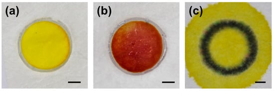 To demonstrate possible applications of the surfactant-resistant barrier, a bacteria sample was detected on an embossed PP test zone. As mentioned previously, the enzyme-based bacteria detection involves lysis of the cells using lysis buffer, which contains surfactants that solubilize the cell membrane and release its internal enzymes. E. coli’s intracellular enzyme β-galactosidase breaks down the CPRG and the change in its color from yellow to magenta indicates the presence of the bacteria. Sample solutions containing bacteria mixed with lysis buffer and CPRG were loaded into the test zones. Figure 5a,b shows that both negative and positive control samples are contained within the embossed barrier without any leakage and the presence of bacteria can be distinguished by the color change. On the contrary, as reported previously, the sample breaches through the wax-printed barrier (Figure 5c), which is detrimental to analysis [18,19]. This result shows that an embossed barrier is compatible with surfactant-based buffers for bioassay applications and also has the potential to be used to create arrays of paper-based microzones [24]. It is worth noting that the samples remained wet within the test zone throughout the entire incubation time without leaking, indicating that the barrier does not leak over time.