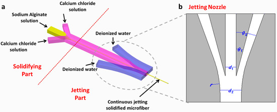 Considerable research has been conducted on a microfluidic liquid jet system based on hydrodynamic focusing using high pressure gas sheath or liquid flow [30,31,32] and these studies provide inspiration for us to solve the microfiber jetting problem. Still, these techniques cannot be directly used in the jetting of microfiber, for not considering the microfiber’s formation process through chemical reaction.