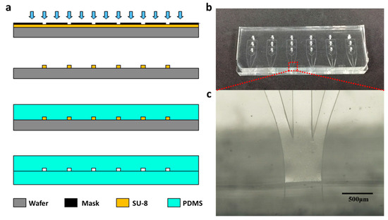 (a) Schematic for soft lithographic fabrication sequence; (b) Photo for microfluidic device with an array of microchannels which can be used individually; (c) The enlarged microscope image for the jetting nozzle corresponding to part in the red dotted rectangle in (b).