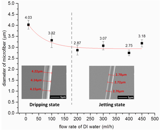 Influence of deionized (DI) water flow rate on the diameter of microfiber. The insets are the scanning electron microscope (SEM) images of uniform microfibers with different diameters.