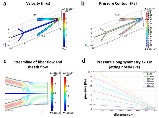 In order to understand the internal flow field which is difficult to be characterized with experiments, computational fluid dynamic (CFD)-simulations using the software COMSOL Multiphysics 5.0 (COMSOL Inc., Stockholm, Sweden) were carried out, as presented in Figure 5. The simulation was performed on the basis of the structure of the proposed microchip and under same condition as that of the experiment: A constant flow rate of 5 mL/h for inner flow, a constant flow rate of 50 mL/h for CaCl2, and flow rates varying from 0 to 500 mL/h for DI water. Figure 5a,b separately show the velocity distribution and the pressure contour in the microchannel under 300 mL/h of DI water, where the water stably jets from the outlet of the chip. In particular, the velocity distribution of the inner flow and the sheath flow is shown in the Figure 5c using streamline, which demonstrates the focusing effect of sheath flow on the inner flow. Figure 5d shows the pressure distribution curves along the symmetry axis of the jetting nozzle under different flow rates of DI water. The results showed that the pressure has an approximate linear relationship with distance to the outlet, that is, the pressure gradient remained constant. But the microfiber withstands various pressures in the jetting part of the chip under different flow rates of DI water. The simulation results suggest that designing a microchannel with sufficient length for microfiber solidification is crucial for obtaining stable microfiber morphology. Actually, the length of the microchannel between the solidifying and jetting parts in the proposed microchip was enough, so the central flow had been completely solidified before flowing to the jetting part of the chip. Therefore, the experimental results showed that the DI water’s flow rate had a minimal effect on the morphology of the microfiber.