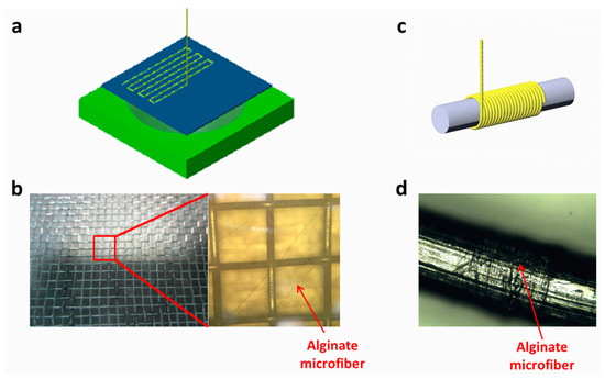 Microfiber collection and assembly. (a) Schematic of alginate microfiber patterning process. (b) Optical images of patterned alginate microfiber on a metal net substrate and the part in the red rectangle is enlarged on the right where alginate microfiber can be observed. (c) Schematic of alginate microfiber reeling process. (d) Optical image of reeled alginate microfiber on a wire.