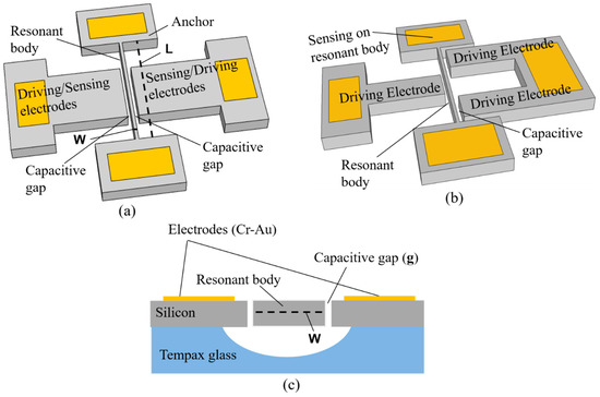 Figure 1a,b present a perspective-view schematic of the fixed-fixed beam capacitive silicon resonators with first and third mode vibration, respectively. The basic components of resonator structures are the resonant body, capacitive gaps, the driving electrode, and the sensing electrode. The resonant body is suspended by the two anchors at each end of the resonant body on the patterned glass substrate. The cross-sectional view of the resonator structures is shown in Figure 1c. For the first mode vibration structure, the driving electrode is placed along the side of the resonant body and the sensing electrode is placed in another side of the resonant body, as shown in Figure 1a. They are separated from the resonant body by narrow capacitive gaps. In turn, for the third mode vibration, the driving electrodes are designed and placed on the both sides of the resonant body and the sensing electrode, as the motional detection is on the resonant body electrode (Figure 1b). The high-order mode vibration structures are decided by the number of the driving electrodes along the resonant body. The number of driving electrodes for the second, third, and fourth mode vibration is 2, 3, and 4, respectively.