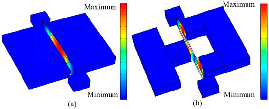 The fixed-fixed beam resonators presented in this work are designed for lateral vibration as a flexural mode. A finite element method model is built by COMSOL (Version 5.2a, Keisoku Engineering System Co., Ltd, Tokyo, Japan) for a prediction of the vibration shape and the resonant frequency. Figure 2a,b show the vibration shapes of the first and third modes, respectively. The colors correspond to total in-plane displacement, where red denotes the maximum displacement and blue represents no displacement. Other vibration mode shapes can be found in Table 1.