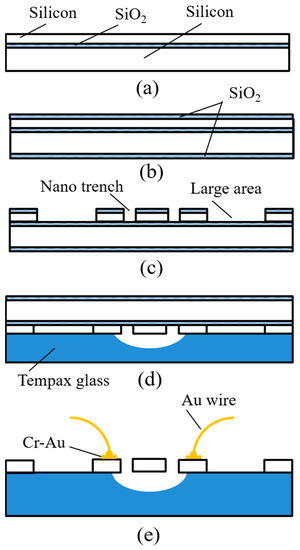 Figure 3. Fabrication process. (a) Silicon on insulator (SOI) wafer (7 μm/ 1 μm/ 300 μm); (b) thermal oxidation; (c) combination of electron beam (EB) lithography, photolithography, and deep reactive ion etching (RIE) process; (d) anodic bonding; (e) backside silicon etching, SiO2 removal, and metal contact pads.