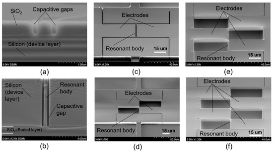 Figure 4. Fabricated results. (a) SiO2 patterning with EB resist and using the RIE technique; (b) resonant body and narrow trenches formed by deep RIE; (c) first mode vibration structure; (d) second mode vibration structure; (e) third mode vibration structure; (f) fourth mode vibration structure.