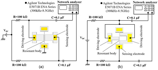 To detect the motion of the first mode vibration structure, the setup shown in Figure 5a is employed. The output and input ports of the network analyzer are connected to the driving and sensing electrodes, respectively, through the resistors and capacitors, while the resonant body electrode is attached to the ground. The purpose of usage of the resistors and capacitors is to decouple the radio frequency (RF) signal and also to avoid damaging the network analyzer. In turn, to the high-order mode vibration, all driving electrodes on both sides of the resonant body electrode are connected to the output port of the network analyzer while the resonant body is connected to the input port of the network analyzer (Figure 5b).