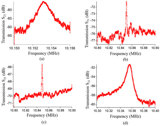 The resonant peak of the first mode vibration structure is found at 10.15 MHz with a quality factor Q of 10,000, as shown in Figure 6a. The measured resonant frequency is in good agreement with the FEM simulation result (Table 1). Figure 6b–d show the frequency responses of the second, third, and fourth mode vibration structures, respectively. No other vibration modes were observed in these resonators.