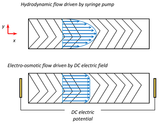Schematic of two driven modes in this work, hydrodynamic flow and electro-osmotic flow.