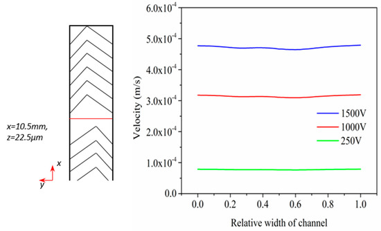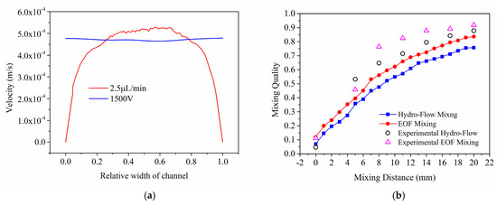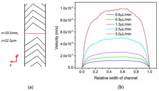 Fisrt, we compare the flow field distribution in these two modes. As shown in Figure 8a, with a same flow rate at 2.5 µL/min, the flow field distribution differs under different driven methods. As discussed above in Section 4.1 and Section 4.2, the flow fields differ from typical Poiseuille flow and electroosmotic flow, due to the influence of herringbone pattern. In comparison, in the electro-osmotic flow, the velocity shows a much lower gradient in cross direction.